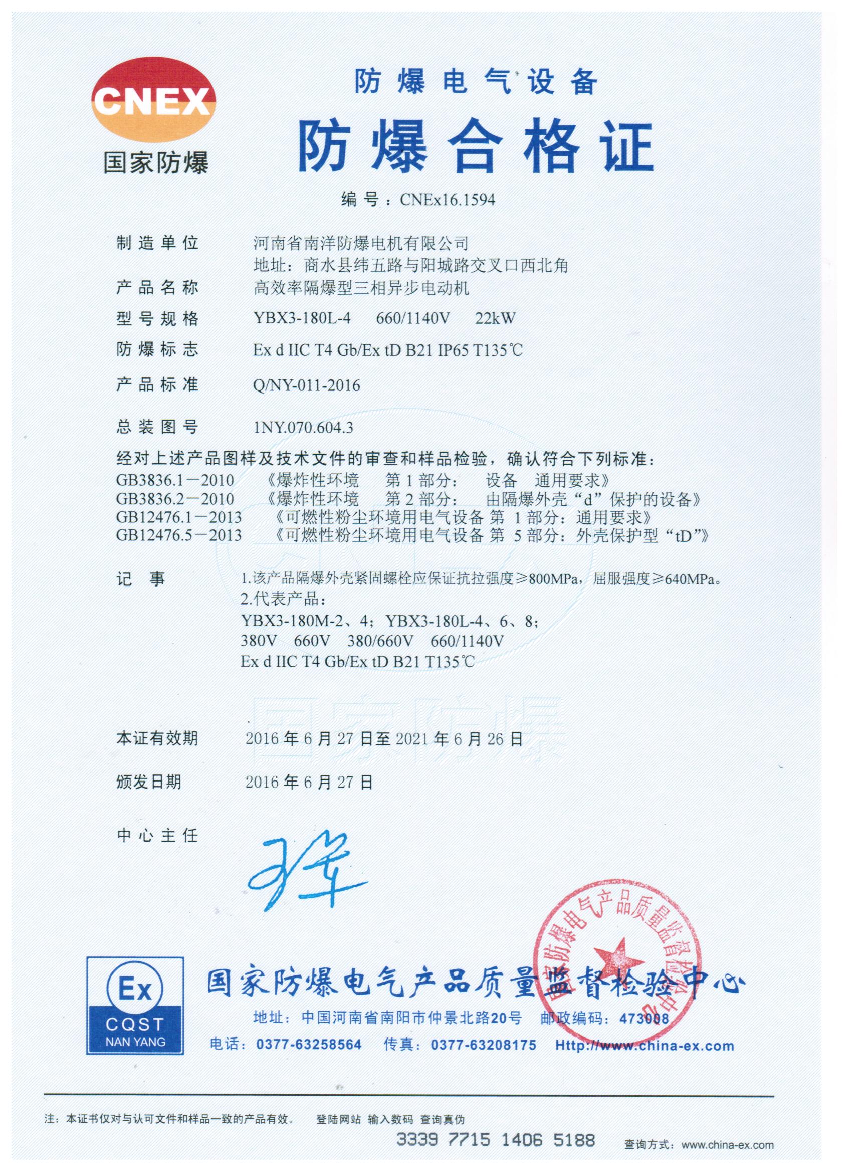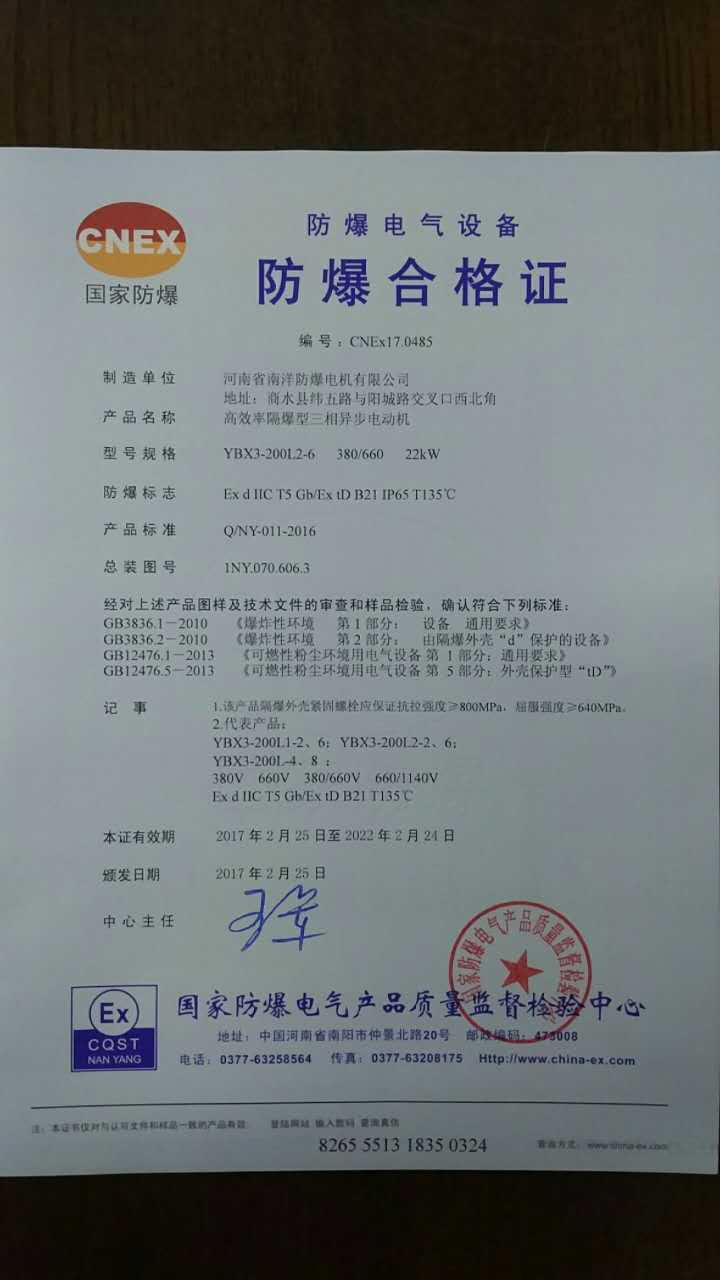 河南省南洋防爆電機有限公司全體員工經過不懈努力,潛心專研,榮獲了由國家防爆電氣檢測中心,頒布的YBX3高效節能防爆電機防爆等級EXDIICT5,防護等級IP65的防爆合格證,為廣大企業的安全生產提供了有力保障。