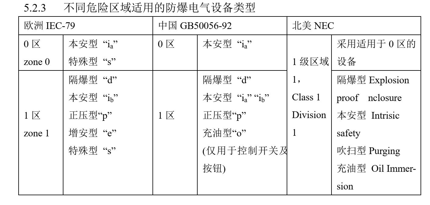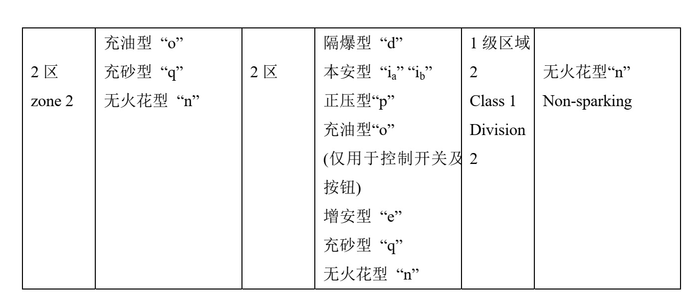 注:1于0區的防爆設備可用于1區和2區;用于1區的設備可用于2區;