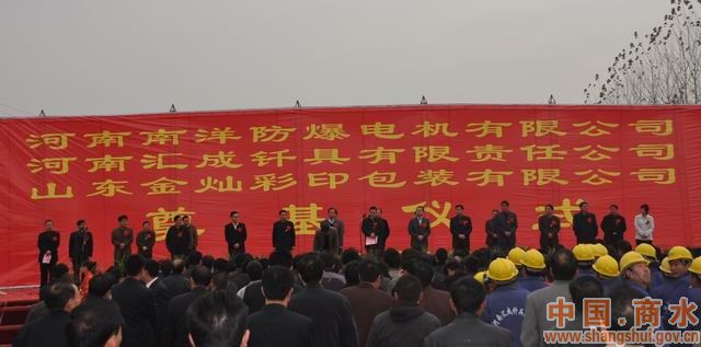 11月14日上午,縣工業集聚區彩旗飄飄,軍樂陣陣,南洋防爆機電、河南匯成釬具、滕州金燦彩印等三家招商引資企業舉行奠基儀式。縣委書記劉政帶領縣四個班子領導出席開工典禮并為三個項目培土奠基。